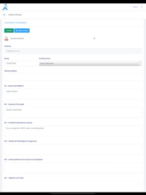- Fichas de avaliação personalizadas, cada profissional pode cadastrar seu modelo de ficha de avaliação (anamnese).