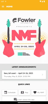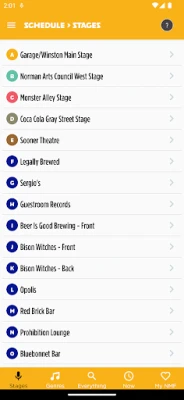 This App contains everything you will need to enhance your experience at this year's Norman Music Festival in Norman, Oklahoma. It contains a schedule of all the events sorted by stage, day of week, genre and even a favorites section for you to be productive throughout the weekend. You can drill into each band's website to learn more about them. The application also highlights a map of the festival, smoking vs. non-smoking events, and various social networking links to help you make the most of this great, annual festival.