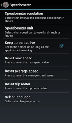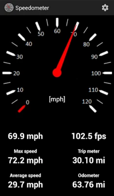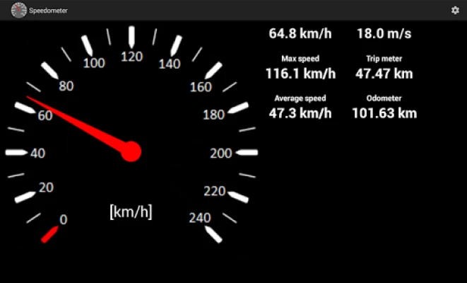 * Analogue and digital speedometer. * Choose from four different speedometer resolutions for the analogue gauge: 0-30, 0-60, 0-120 or 0-240 speed units. * The speed can be displayed in one of three different units: kilometers per hour (km/h), miles per hour (mph) or knots (nautical miles per hour). * When unit km/h is selected the speed in m/s (meter/second) is also displayed. * When unit mph is selected the speed in fps (feet per second) is also displayed. * Max speed * Average speed * Tripmeter * Odometer * Possibility to pause the meters by a "long click" on the screen.