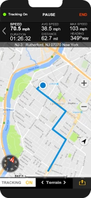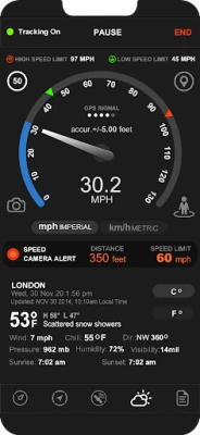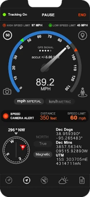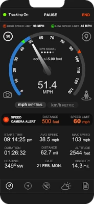 - Speed tracking in mph or km/h based on MPH or KM/H mode.